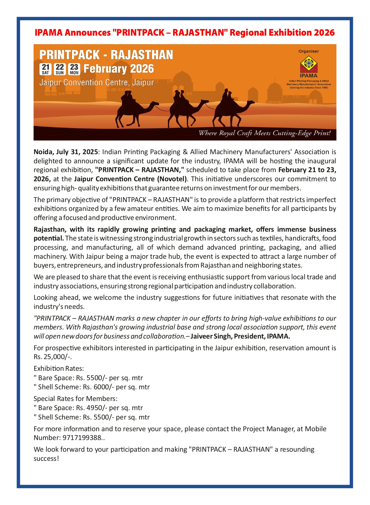 Noida, June 25, 2025 – The 17th edition of PRINTPACK INDIA has once again set a remarkable precedent in the industry with an overwhelming response on its opening day. On June 25, 2025, IPAMA (Indian Printing, Packaging and Allied Machinery Manufacturers' Association) received an astounding 335 bookings, covering around 85% of the exhibition space (Area calculation based on previous participation and projection) at the India Expo Centre, Greater Noida, NCR, and the open space for hangars.