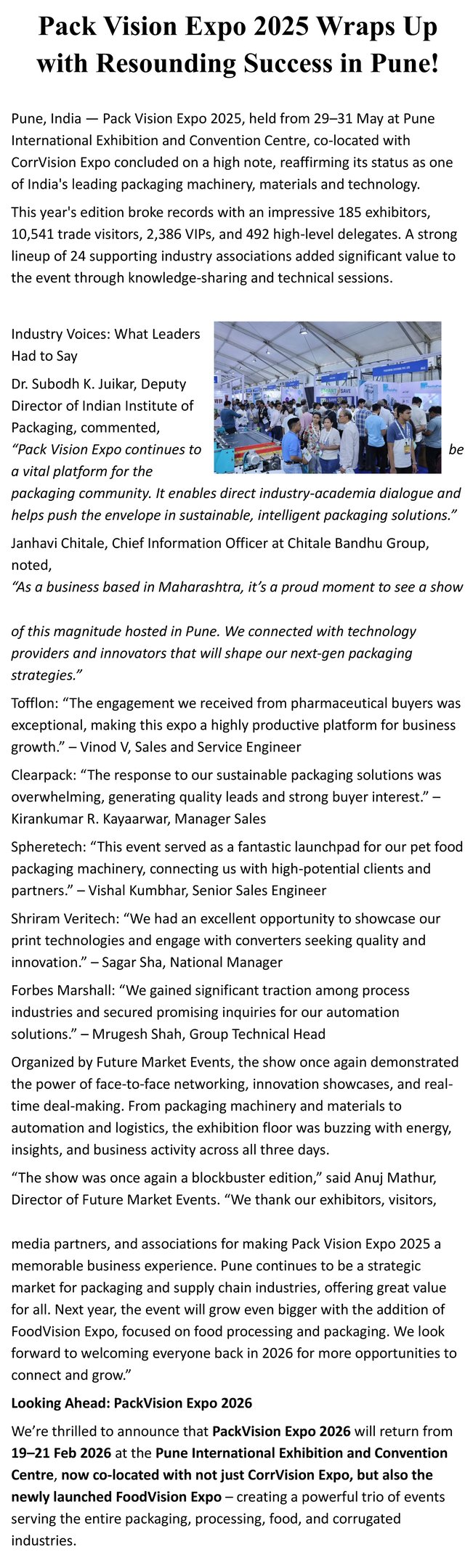 “We anticipate over 9,000 attendees, including corrugators, printers, and packaging professionals. Held alongside PackVision Expo and Label Technology Show, these events collectively represent Pune’s largest gathering for the printing and packaging industries. We eagerly look forward to welcoming industry leaders and professionals,” concluded Ms. Chopra.